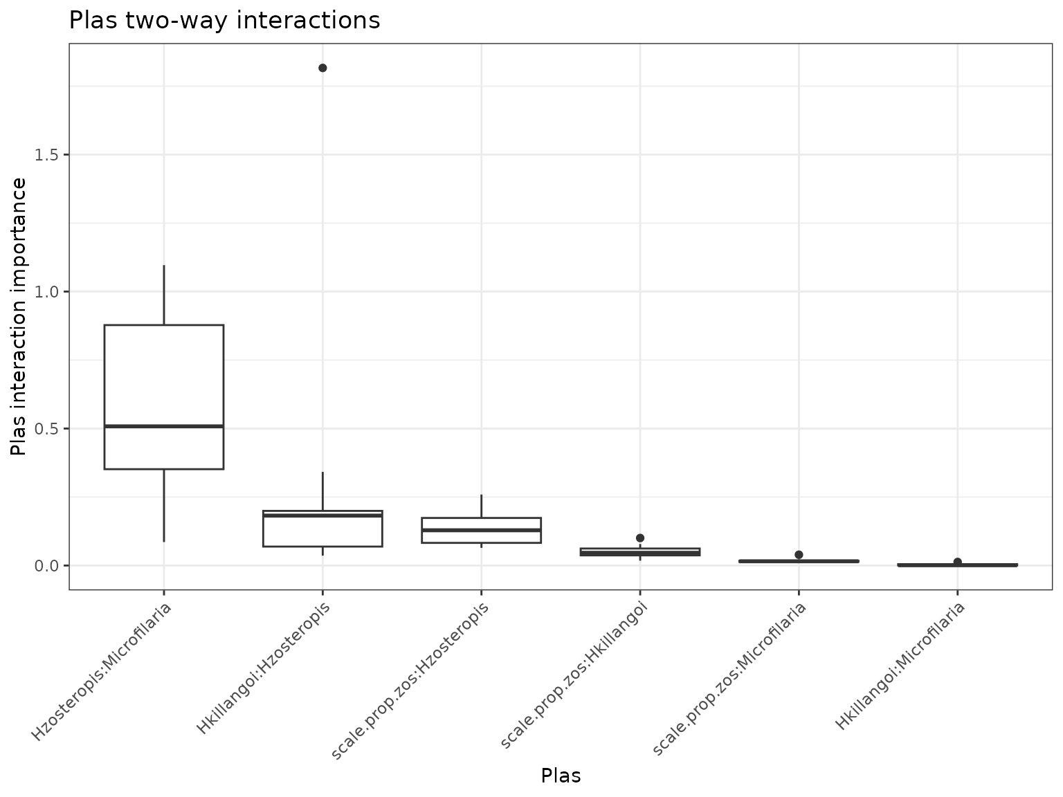 The first plot shows that interactions account for an average of 60% (with a 90% bootstrap uncertainty interval of 44–81%) of variation in predictions for H.killangoi, and less for the other taxa. The second plot shows that interactions involving host abundance most affect predictions of Plasmodium (although H.zosteropis is also important and, according to the uncertainty intervals, could be even more important). This trend is similar community-wide. The last plot shows that the interaction between Haemoproteus presence and host abundance is the most important two-way interaction for Plasmodium, but this isn’t true community-wide, as host abundance and H.zosteropis form the strongest interaction overall. Taken together, we can see that interactions between taxa are mediated by host abundance.